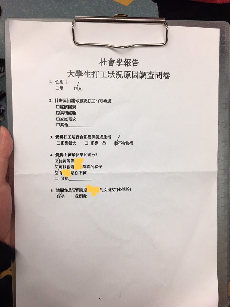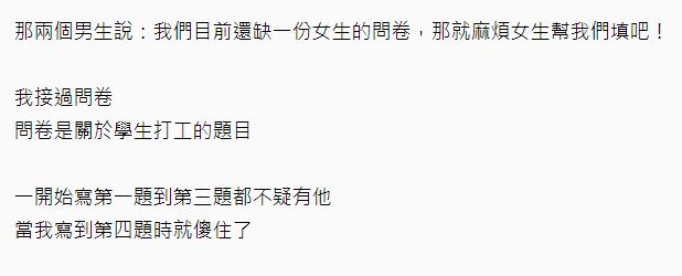 ▼路途上突然以後兩個男生出現,表示自己是大學生需要做問卷調查,原po看男生沒有拒絕的意思,於是也答應了,結果這兩個男生補充「我們目前還缺一份女生的問卷,那就麻煩女生幫我們填吧!」原po也不疑有他的認真填寫了。