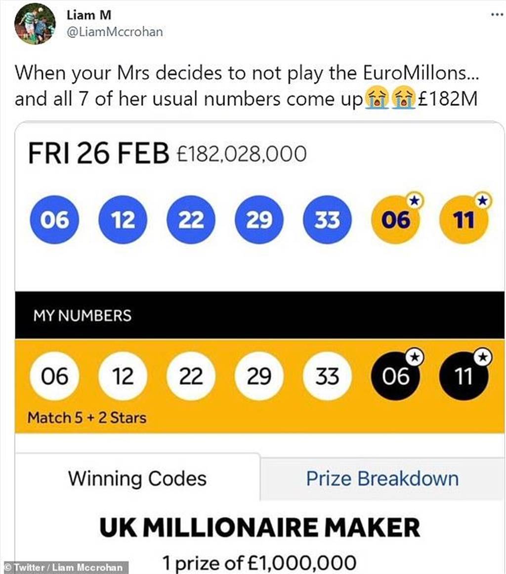 ▼Rachel和丈夫每週都會用「6、12、22、29、33與特別號6、11」這組號碼買「歐洲百萬(Euromillions)」彩券。他們向銀行申請自動扣款,就算自己忘記也能買。2月26日那天,他們看兌獎APP時,一下子跳出了「比賽獲勝」字眼,他們連忙查看,那一期的頭獎號碼正是「6、12、22、29、33與特別號6、11」!