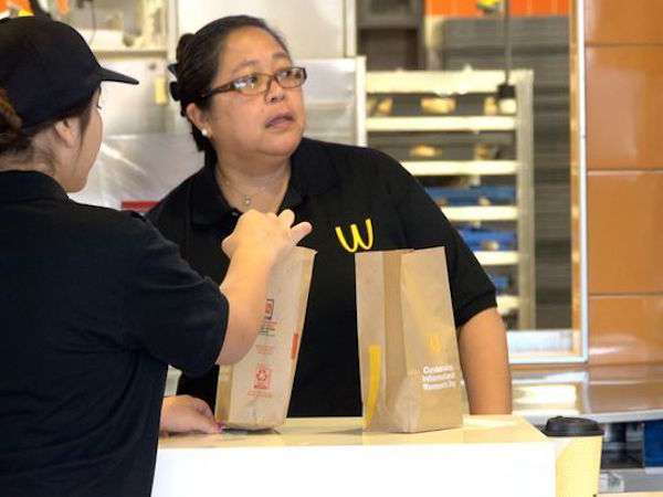 ▼不只是店面的金黃色招牌,員工制服、餐點上,所有處有可及的「M」都被倒轉了過來。麥當勞的多元文化主管溫蒂(Wendy Lewis)說,這是麥當勞第一次這樣嘗試,目的是紀念各地婦女的卓越成就,尤其是在麥當勞工作的女性。
