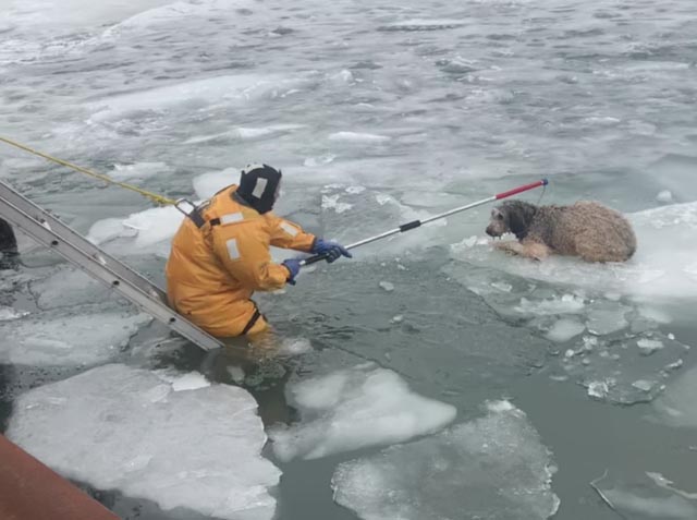 ▼救援人員將被困浮冰的狗狗救上岸:
