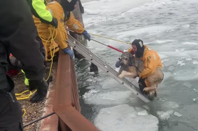 ▼救援人員架設梯子,沿梯走到Lucy附近,然後用套索抓住牠的脖子,將牠拉到岸上。這一過程花了30分鐘,參與救援行動的助理消防隊長Tom Lyon表示,那隻狗狗被救上岸時,睜著一雙棕色的大眼睛,眼神中充滿感激之情。當時牠的情況很糟糕,如果沒有及時將牠救上來,牠很可能被凍死或淹死。