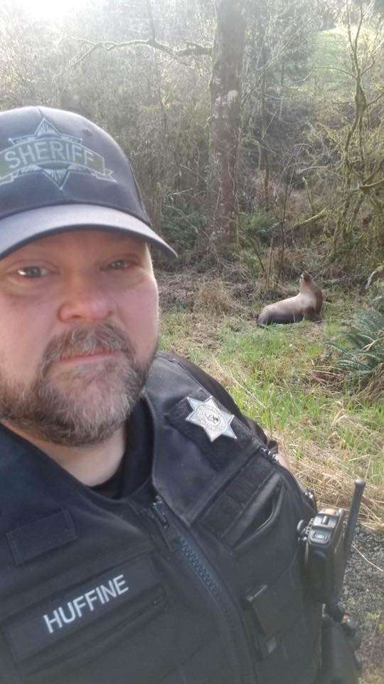▼員警Corey Huffine表示,他到達現場時海獅似乎也對眼前的情況很迷茫,正在努力找回家的路。他聯絡當地的志願者還有動保團體,等待拖車到來的這段時間拿出手機跟海獅自拍,留下了一張有趣的合照。