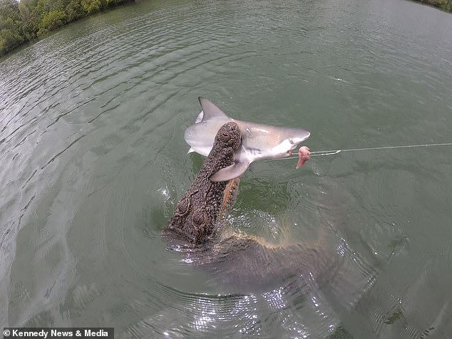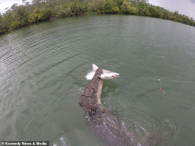 ▼Barnes拉住釣竿,想把鯊魚從鱷魚的嘴巴裡搶回來,但鱷魚的力量太大,他最終決定將鯊魚讓給鱷魚,讓牠飽餐一頓。Trutwein說:「我拍攝野生動物30年了,經常看到鱷魚,但從來沒有遇到過這樣的事。這太令人震驚了,近距離看到這一幕簡直難以置信!」