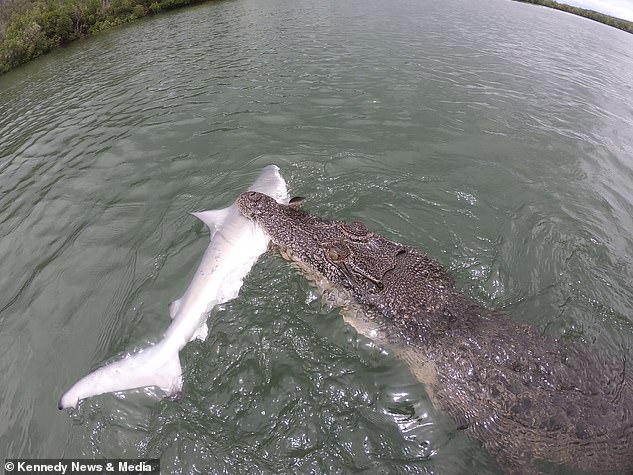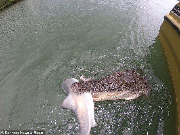 2022年03月10日最近澳洲溫德姆(Wyndham)以西80公里處出現了罕見的一幕。一位漁民釣到一條小鯊魚,他正準備將鯊魚拖到船上,沒想到一隻鱷魚突然從水中冒出來,緊緊咬住鯊魚不放。鱷魚跟漁民展開一場拉鋸戰,最後鱷魚成功將鯊魚搶走了~