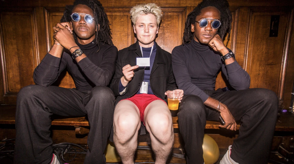 ▼Oobah在門口被工作人員攔下來,他故作淡定地拿出偽造的名片,成功換到時裝周的入場證件。入場之後,他跟那些有名的時裝設計師、模特兒攀談,還向對方展示自己身上的衣服。他表現得非常自信,大部分人都相信了他的話,認為「Georgio Peviani」是一個很有名的品牌。