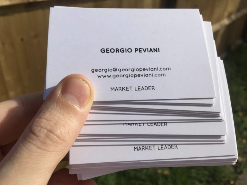 ▼Oobah接著做了幾張精美的名片,名片上印有時尚品牌創始人「Georgio Peviani」的名字,公司的定位則是「market leader」。他帶著一堆地攤牛仔褲來到法國巴黎,一路探聽才知道時裝秀的走秀會場地址。