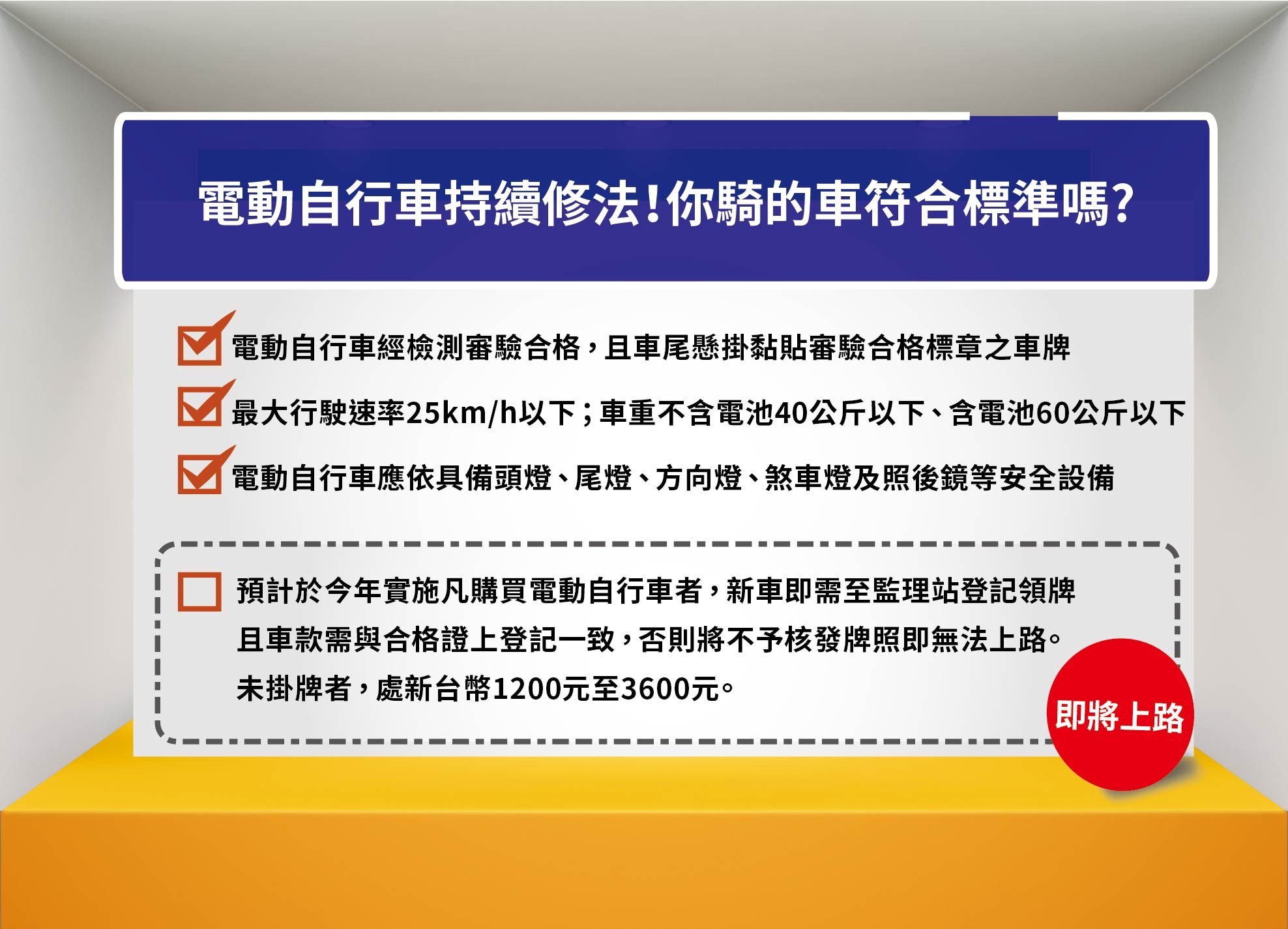 2022年03月12日現在路上的電動自行車越來越多,與之相關的交通事故頻發,但因為沒有掛牌,警方不太能管理約束。交通部2020年9月預告修正道路交通管理處罰條例部分條文草案,規範電動自行車須掛牌,違者可罰新台幣1,200元至3,600元。新法實施後,所有的電動自行車2年內都要掛牌才能上路~