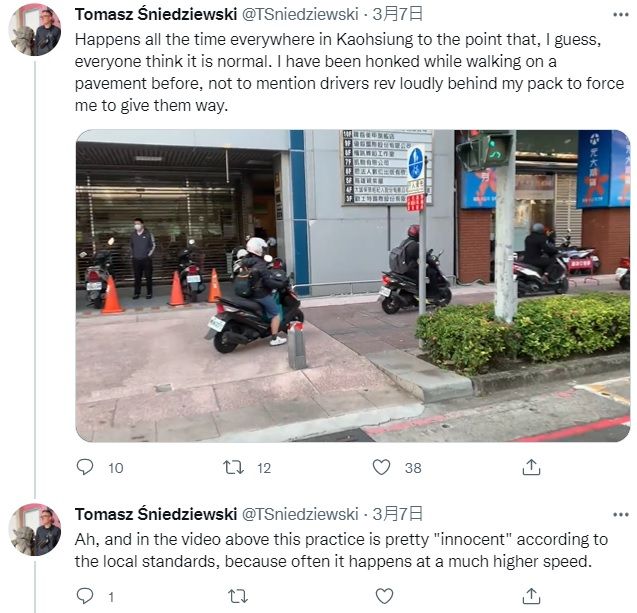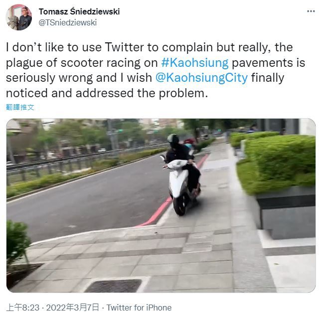 2022年03月12日居住在高雄的波蘭籍記者Tomasz Śniedziewski日前在推特抱怨高雄機車騎上人行道飆速的交通亂象。高雄市長陳其邁看到後直言「很不應該」,並下令嚴格執法取締。據警方最新統計,自10日晚間8點至11日晚間8點,各單位取締汽、機車行駛人行道1043件。