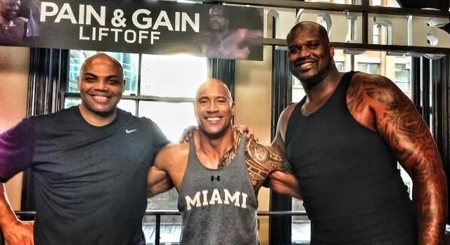 ▼巨石強森跟「俠客」歐尼爾站在一起,也變得很渺小。巨石強森比他矮一個頭,整個人的線條好像也小了好幾個Size,反差怎麼會這麼大啦。
