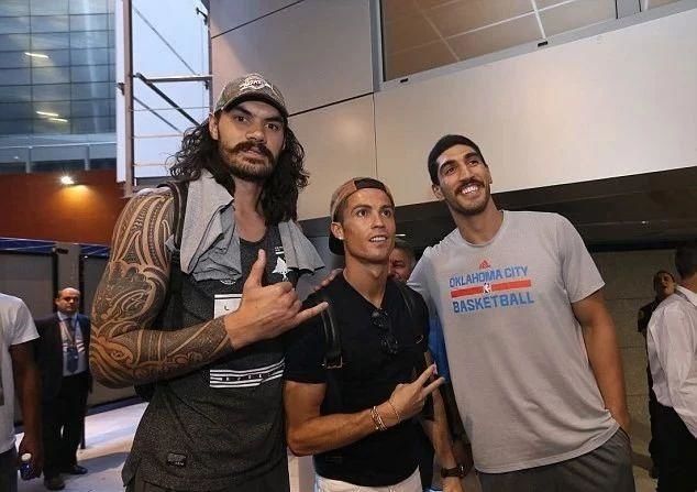 ▼有一次C羅偶遇雷霆的內線雙塔「亞當斯與坎特」,在兩位身高213公分、210公分的NBA球員身邊,C羅瞬間變成了「小鳥依人」的那一個。