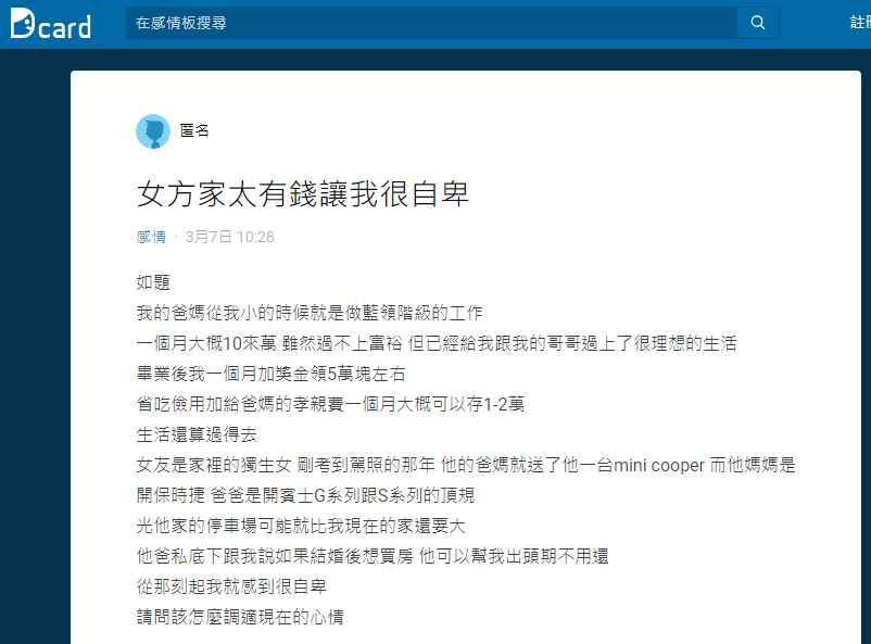 2023年12月10日另一半的條件比自己好太多,你會覺得自卑嗎?最近一名男網友在「Dcard感情版」發文說,他的爸媽都是藍領階級,女友家境優渥,他感覺壓力很大。準岳父提議婚後可以幫他們出買房的頭期款,這讓原po的自卑心情更加難以調適,他向網友們求助:「該怎麼調適現在的心情?」