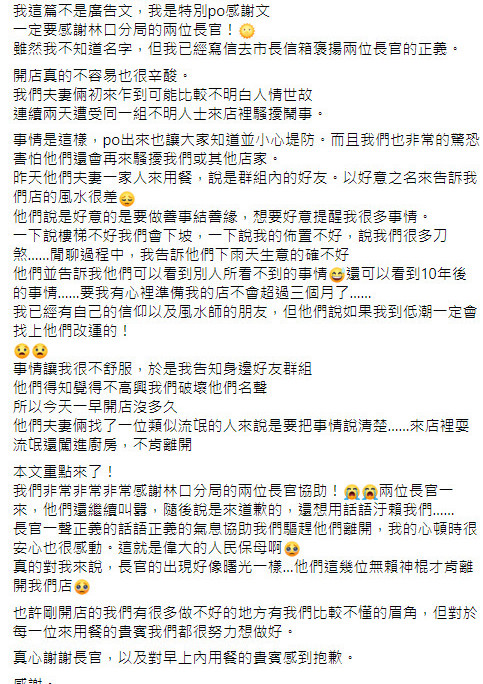 2022年03月12日日前新北市林口區一間開業不久的早餐店來了兩位不速之客,那是一對夫妻,兩人一進門就開始說「店內風水很差」、「不到三個月會倒」之類的話。店家非常困擾,最後只能報警,2名警員到來後事情才順利解決。老闆娘直呼:「長官的出現好像曙光,真的是偉大的人民保母。」