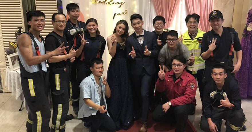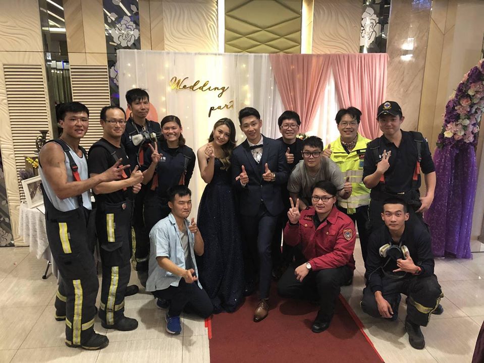 ▼消防員們身上的裝備都沒來得及卸下來,有人穿著消防衣,有人肩上掛著呼吸面罩,還能聞到火警現場的燒焦味。他們跟新人拍下一張合照,新郎官表示,這是最有味道,也最有溫度的合照。