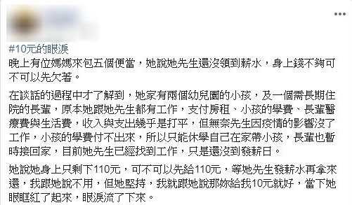 ▼目前她先生已有找到工作了,但是離發薪日還有一段時間,所以媽媽想問可不可以先付110元,剩下等先生發薪後再來還。便當店老闆得知詳情後,豪氣跟這位媽媽說不用給錢,但是她依然堅持要付,所以原Po表示,「那妳先給我10元就好」,那位媽媽當下聽到,忍不住眼眶就泛紅了。