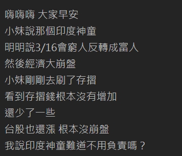 ▼阿南德的預言引發討論,不過有網友在PTT八卦板以「印度神童你給我進來!」為題發文,表示印度神童曾說3月16日窮人反轉成富人,經濟大崩潰,但那天去刷存摺發現錢根本沒有增加,還少了一些,台股也在繼續漲,根本沒有崩盤。原po直言:「印度神童難道不用負責嗎?」