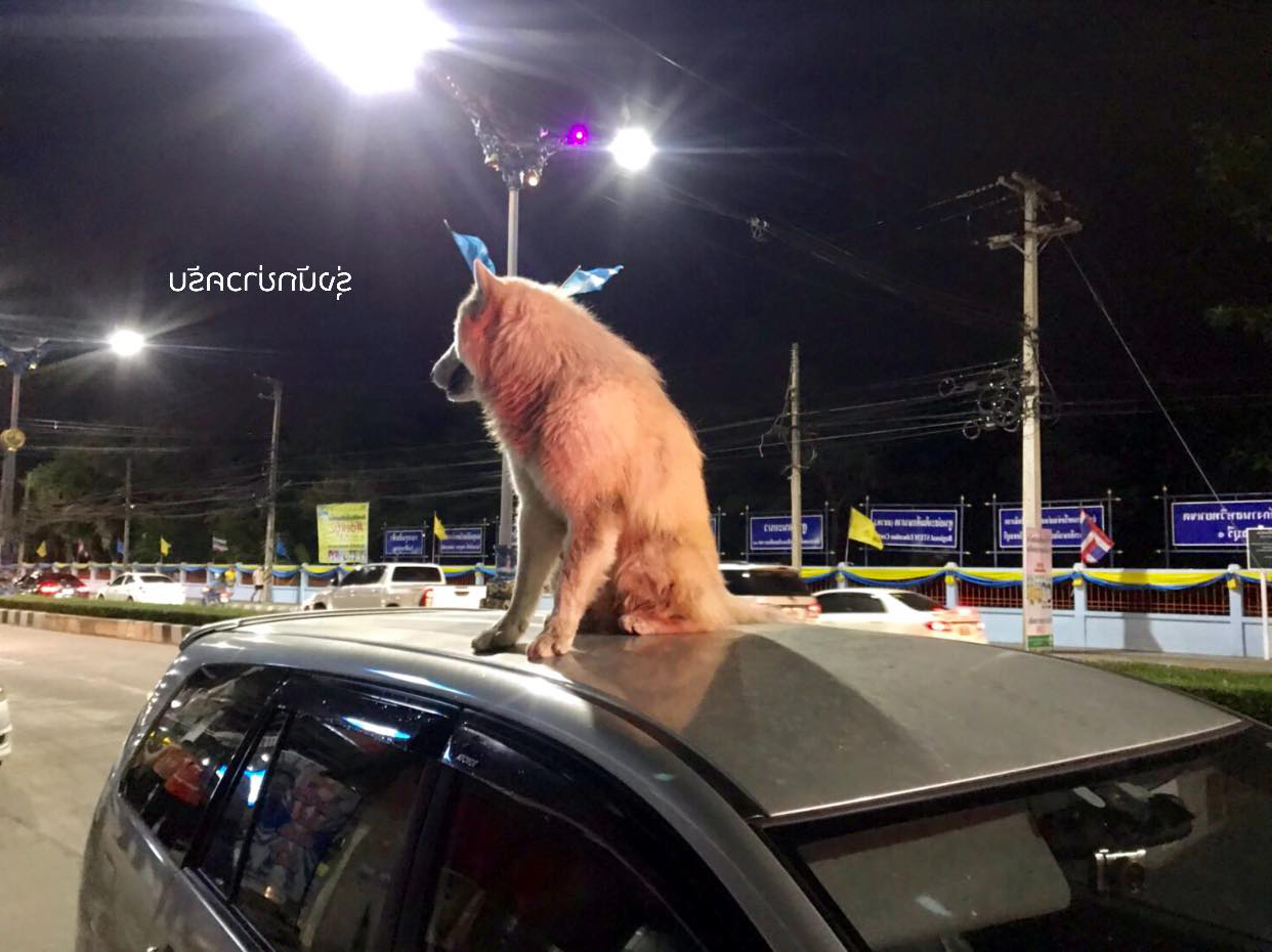 ▼當時女車主準備從學校接孩子回家,結果發現一隻白色的狗狗從引擎蓋跳到了車頂上。這隻狗狗叫Sip Saen,經常會霸佔車頂,在當地小有名氣。只見牠穩穩坐在車頂上,不管車主怎麼驅趕都不下來。