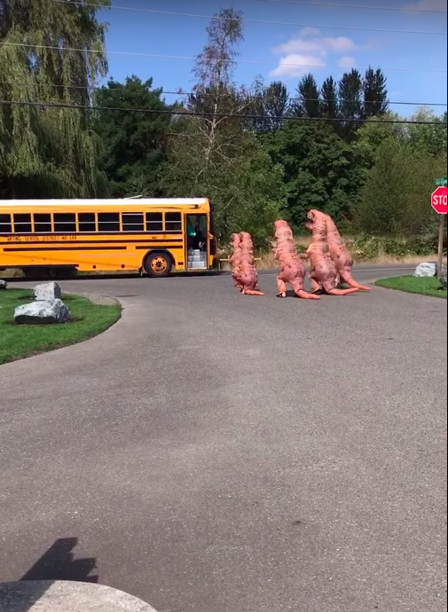 2022年03月18日家人之間很需要幽默感。華盛頓一名女孩放學後搭校車回家,剛剛下車就被5隻「龍」嚇了一跳。原來家人來接她放學,卻全都穿著充氣裝。5隻龍搖搖晃晃跑過來的畫面太有趣,網友們都被笑翻了。
