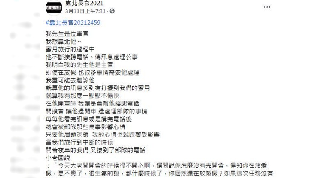 ▼原po提到,休假期間先生每次處理完部隊的事情,心情都會受到影響。尤其是在兩人到中部旅行時,部隊的小老闆突然來電,表示大老闆心情很差,質問原po的老公怎麼沒來開會?得知在放婚假,大老闆竟然很不爽地說:「都什麼時候了,你居然還在放婚假?如果這次任務沒有好成績,就等著被拔掉!」