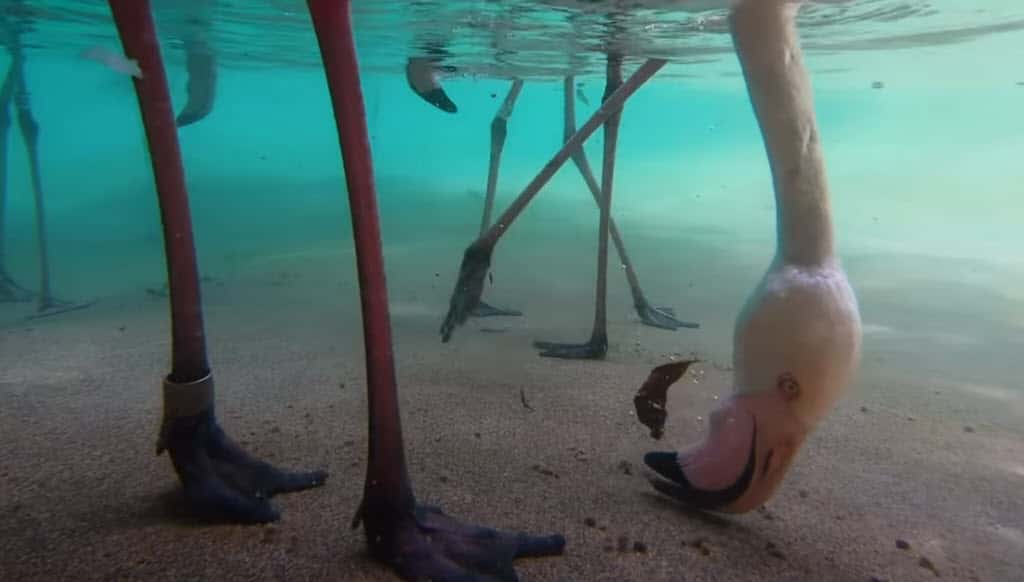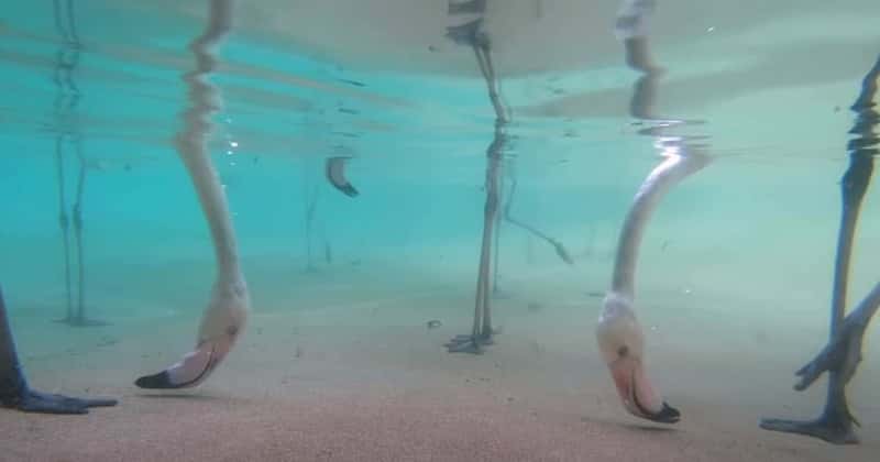 2022年03月18日紅鶴這種大型涉禽全身的羽毛主要是朱紅色,因為羽毛鮮豔,牠們常常被飼養為觀賞鳥。牠們主要靠濾食藻類和浮游生物為生。最近聖地牙哥動物園(San Diego Zoo)po出一段紅鶴在水下覓食的影片,那有趣的場景讓人大開眼界。