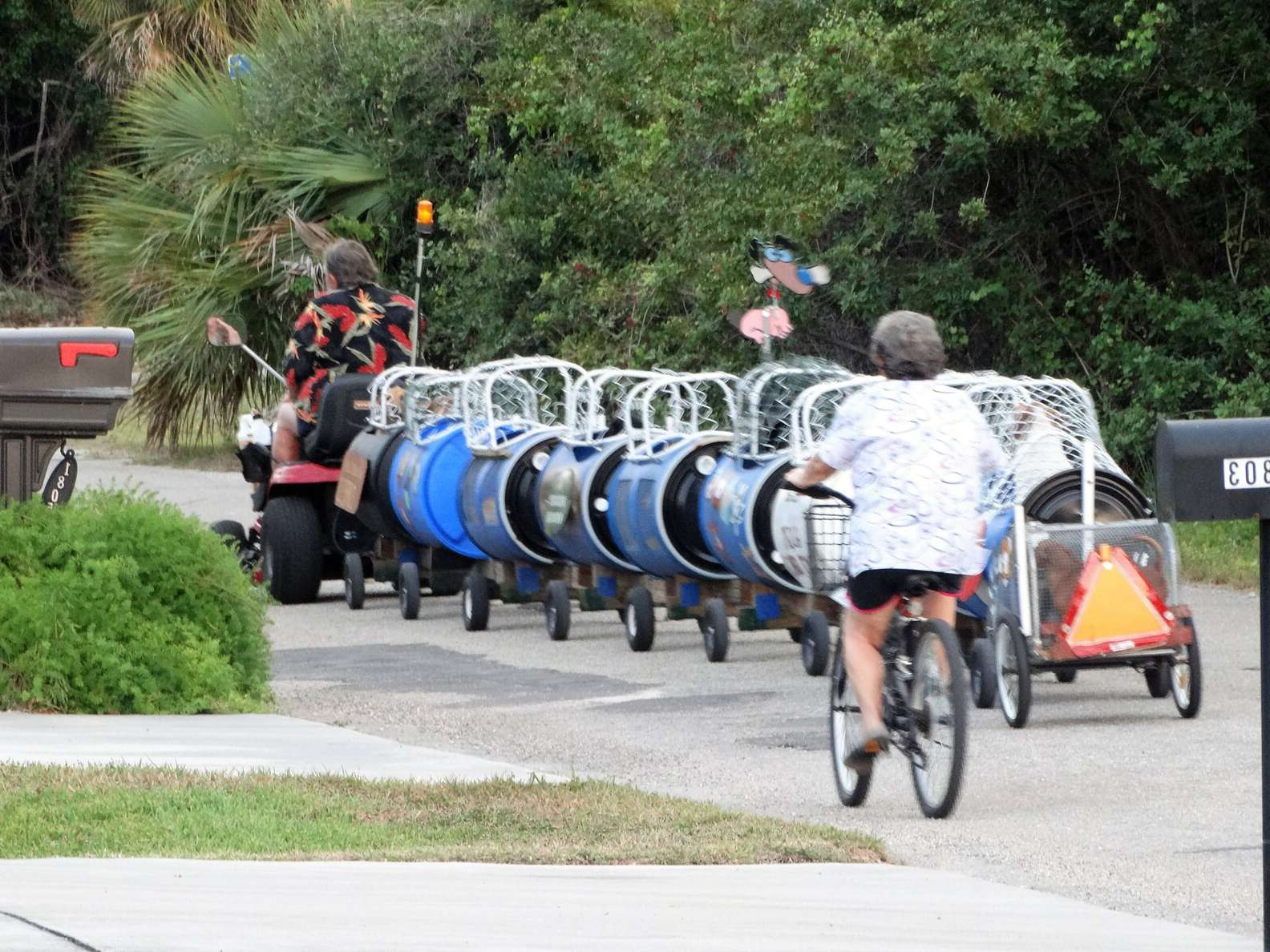 ▼當地民眾看到載滿狗狗的可愛小火車,也覺得很驚奇。現在這已經成為社區的一道風景線了,還有人會帶著零食、站在路邊等待小火車到來,給狗狗們分發零食。