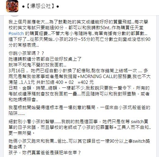 ▼小孩的成績變好,原po非常欣慰,但他有點無奈:「我壓根就覺得這根本是一場刻意的騙局,一個來自小孩坑殺爸爸的陷阱,絕對別小看小孩的智慧,她們只是在等Switch買單的日子來臨。」小孩還加碼要求,希望其他科目考到90分也能拿到獎勵金,原po更傻眼:「孩子,妳們真當爸爸是頭肥羊在宰?」