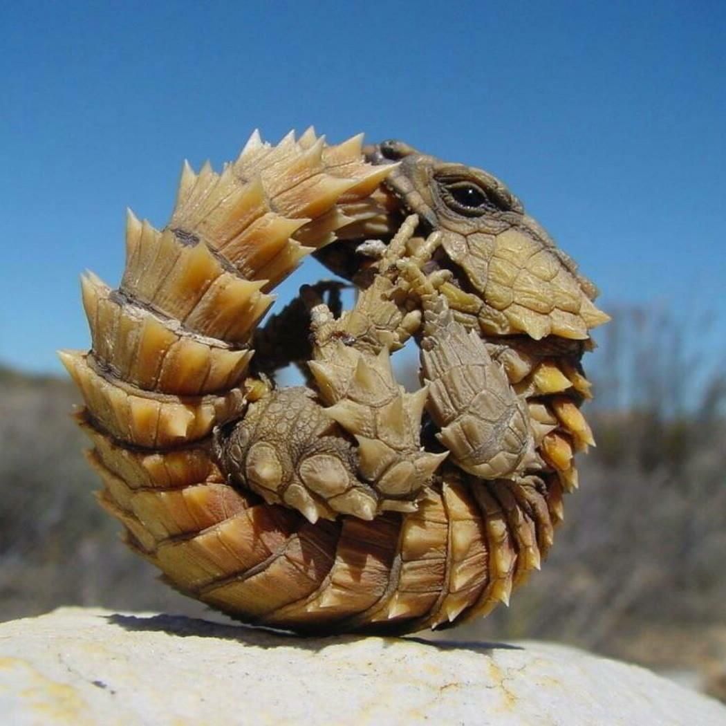 ▼犰狳蜥感到害怕時,會鑽到石頭縫裡,然後用嘴巴咬住尾巴,將自己縮成一個堅不可摧的圓環。這樣能保護柔軟的腹部。如果地理位置適宜,牠們還能順勢滾到別處,逃之夭夭。犰狳蜥奇怪的逃跑方式跟哺乳動物犰狳非常像,這也是牠們名字的由來。
