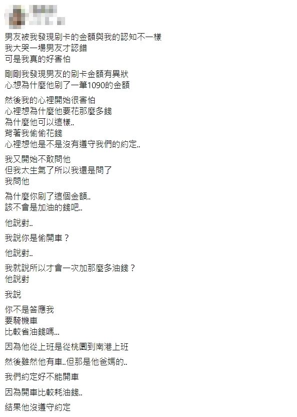 原po表示,她19日發現男友刷了一筆加油費1090元,頓時感覺非常焦躁,還在內心上演小劇場:「為什麼他要花那麼多錢?為什麼他可以這樣?背著我偷偷花錢,是不是沒有遵守我們的約定?」她越想越生氣,決定質問男友:「為什麼你刷了這個金額,該不會是加油的錢吧?」「你是偷開車?」