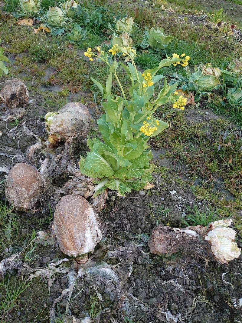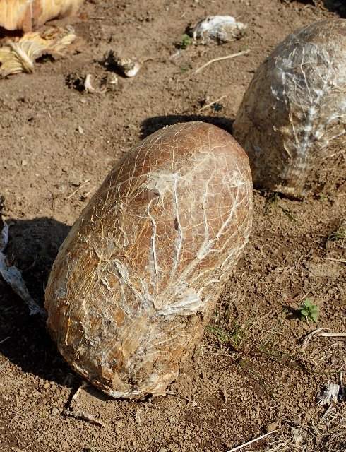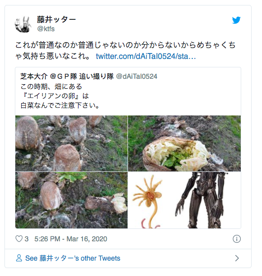 ▼這是推主在老婆家鄉的農田裡拍到的照片。冬天白菜外層菜葉細胞內的水分凍結,葉子枯萎就變成了異形蛋的模樣。這可是只有初春才能看到的限定風景。