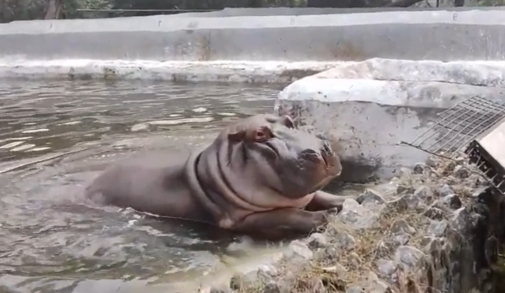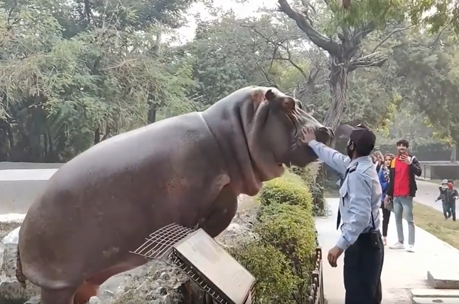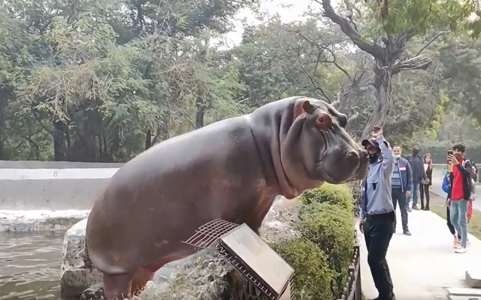 2022年03月29日這隻河馬要蹺家啦~最近有遊客在印度德里動物園(Delhi zoo)中拍到了有趣的一幕。只見一隻河馬從水池爬上岸,還準備跨越隔離的花圃,進入遊客區。但牠的蹺家行動剛開始就結束了,一名保全看到後上前給了牠一巴掌,牠立刻變乖乖牌,又縮回了水池裡。