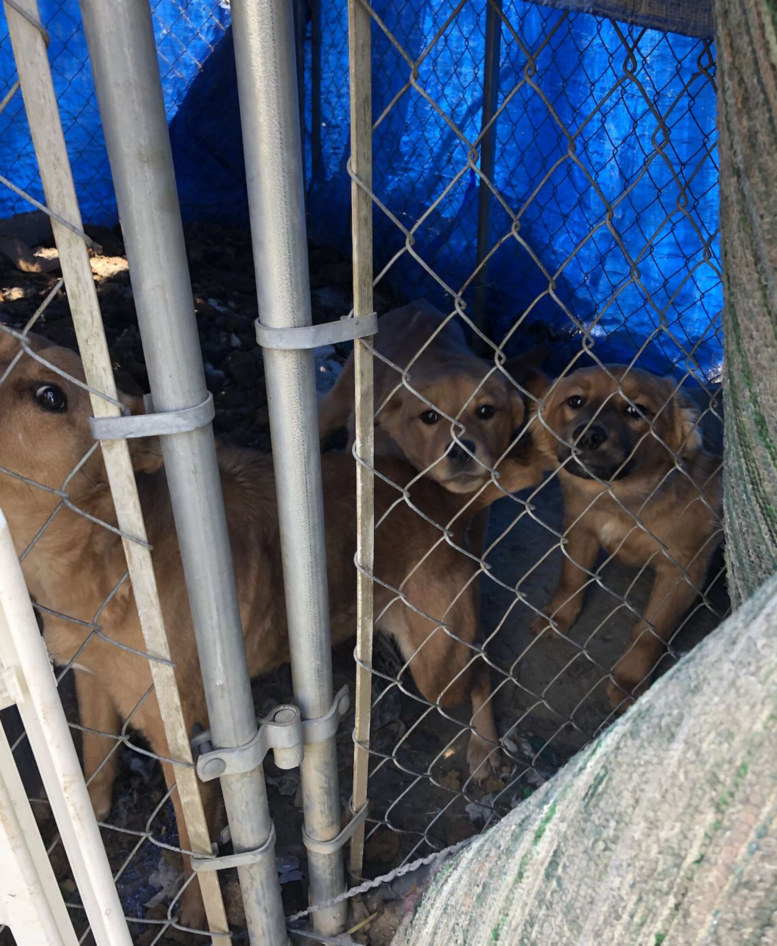 ▼這3隻狗狗被關在狹小的鐵網圍欄裡,頂部只用帆布蓋著,地板上有石頭、泥土和垃圾,環境非常髒亂。Jane和同事連忙將3隻狗狗帶回收容所,讓牠們可以得到妥善的治療與照顧。