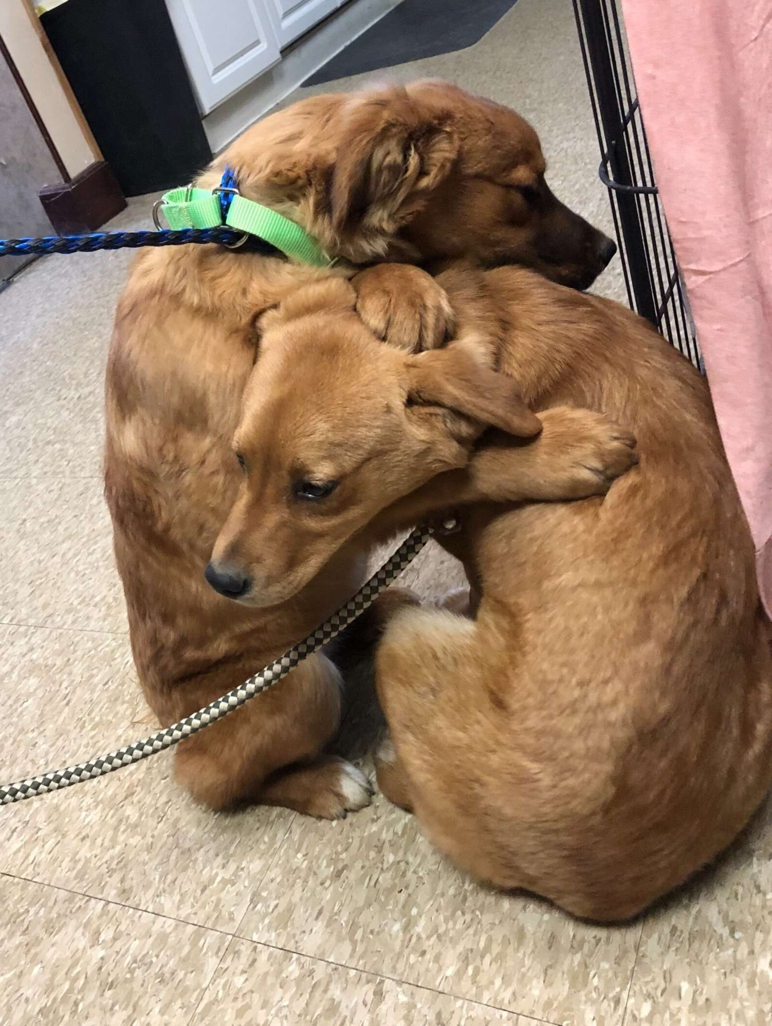 ▼有一次接種疫苗時,狗媽媽先施打完,被帶到別區觀察,2隻小狗竟緊張地抱在一起,那畫面讓人非常不捨。