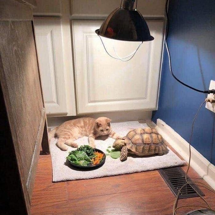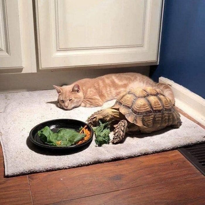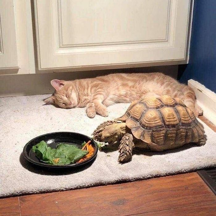 2022年03月30日橘喵除了很愛吃以外,其實也是很有義氣的!最近推特上面流傳了一組照片,照片中是一隻橘貓和一隻烏龜,原來橘喵想要等烏龜吃完飯後,再一起玩耍,但是烏龜的動作實在是太慢了,一大盤的蔬菜當然是不可能馬上吃完的啦~所以橘喵就等到「度估」了起來,後來直接整隻躺平呼呼大睡,而烏龜還沒吃完!來看看這組可愛的跨物種朋友吧~