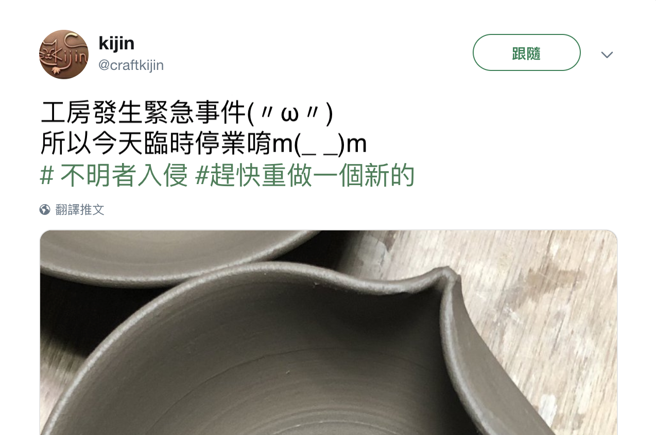 ▼陶器工房「kijin(@craftkijin)」在網上貼出臨時休息的公告,表示有「不明生物」闖入工廠,並貼出一張陶碗的照片。