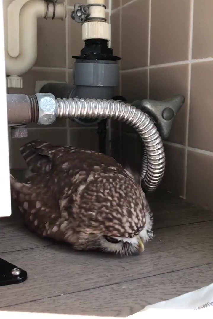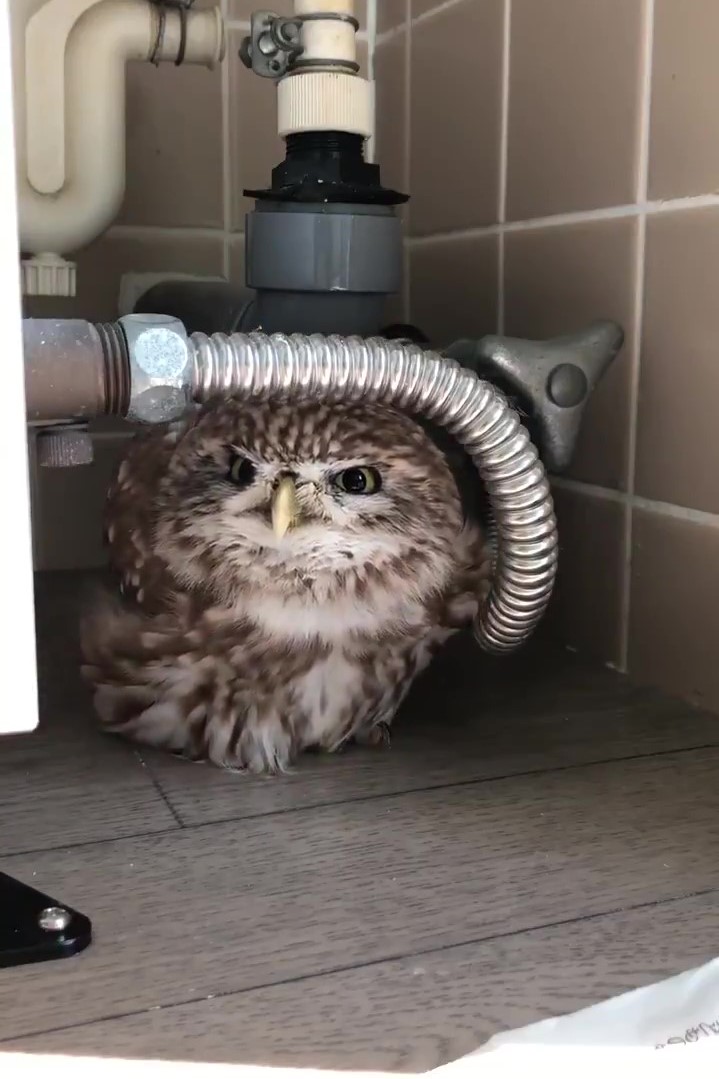 最臭臉避暑!貓頭鷹「一臉嚴肅」躲角落散熱 「膨起來又消風」網萌化:是氣球嗎♡