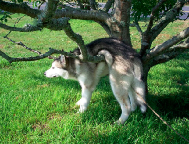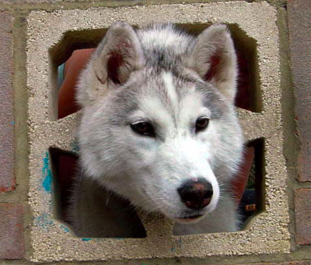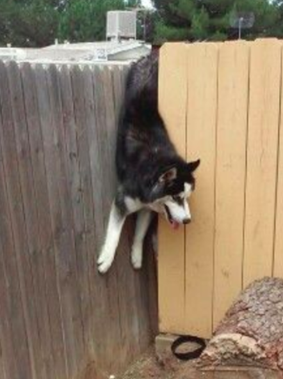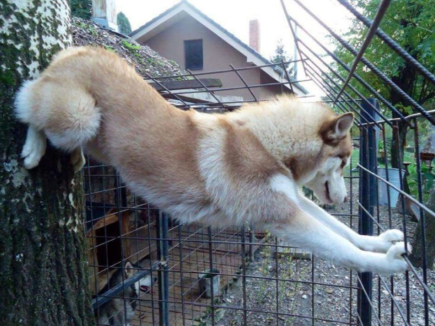 ▼哈士奇很愛嘗試各種障礙物,但他們前腳過了,總是忘記後腳會被卡住…