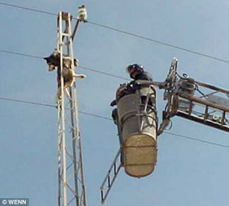 ▼最後只好出動消防人員救牠下來…月月啊,要好好感謝人家,知道嗎?