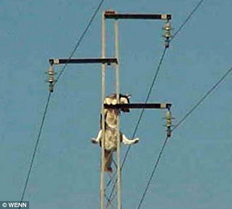 ▼國外一隻月月可能以為自己是鳥,結果爬上電線桿之後就下不來了…