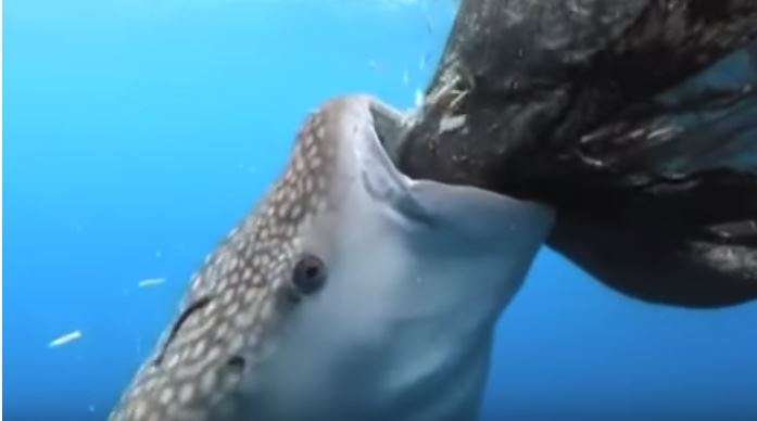 ▼Conservation International分享了這個影片,這隻鯨鯊發現了前面有個裝滿小魚的漁網,袋子是網狀的,雖然有小小的破洞,但魚游進去之後,因為群游的特性,基本上就出不來了,但是鯨鯊還是測試性的吸吮了一番,結果就讓他真的吸到了小魚,不吸則已,一吸鯨鯊啊!這隻鯨鯊就一直吸了又吸,準備要好好飽餐一頓!
