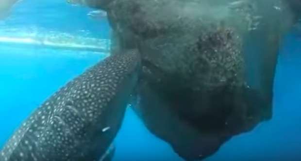 ▼魚真的被吸出來了!於是鯨鯊繼續把握飽餐一頓的時間,繼續狂吸猛吮。