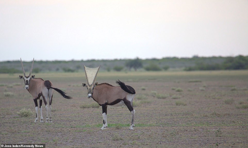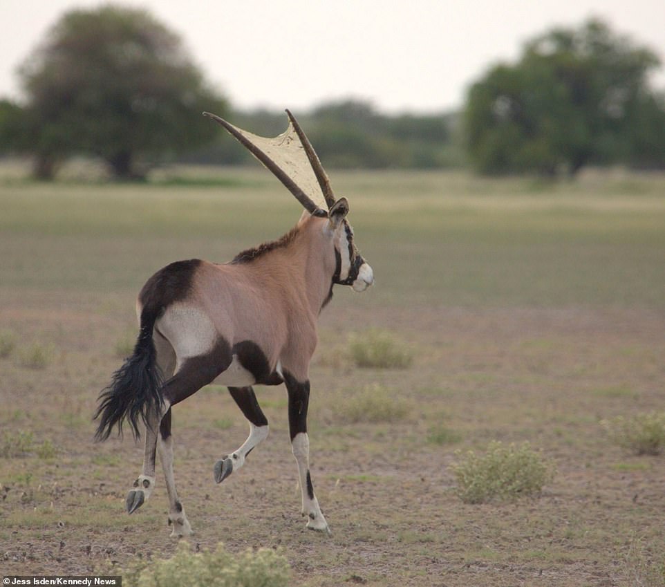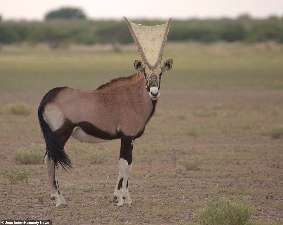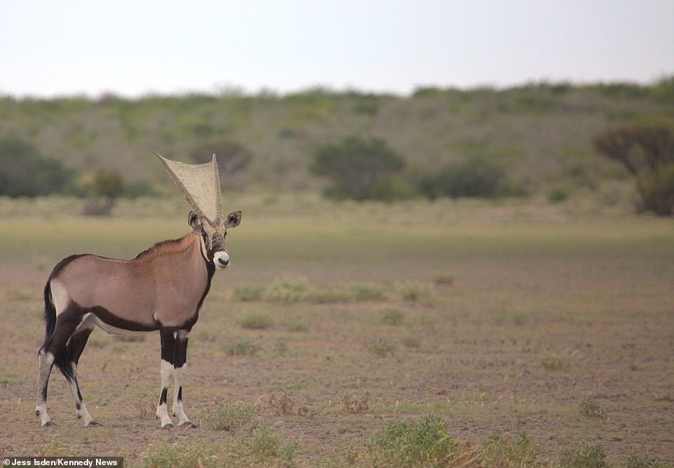 ▼從照片中可以看到,這隻羚羊的尖角之間有一層灰白色的東西,看起來怪怪的。Jess表示,這些照片是她去年參觀的時候拍攝的,一開始她從望遠鏡看到這隻奇怪的羚羊,本以為牠的頭上纏著塑膠袋或其他垃圾,還想幫牠脫困。