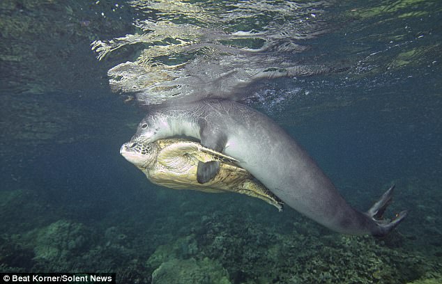 ▼海豹趴到海龜背上,似乎是在安撫牠。牠緊貼在海龜背上20分鐘,找不到幫助對方的辦法,只能無奈游走。海豹離開後,海龜趴到珊瑚礁上休息了一會兒。Korner和攝影團隊的成員這才找到機會,悄悄靠近幫海龜剪掉身上的魚線,成功幫牠脫困。