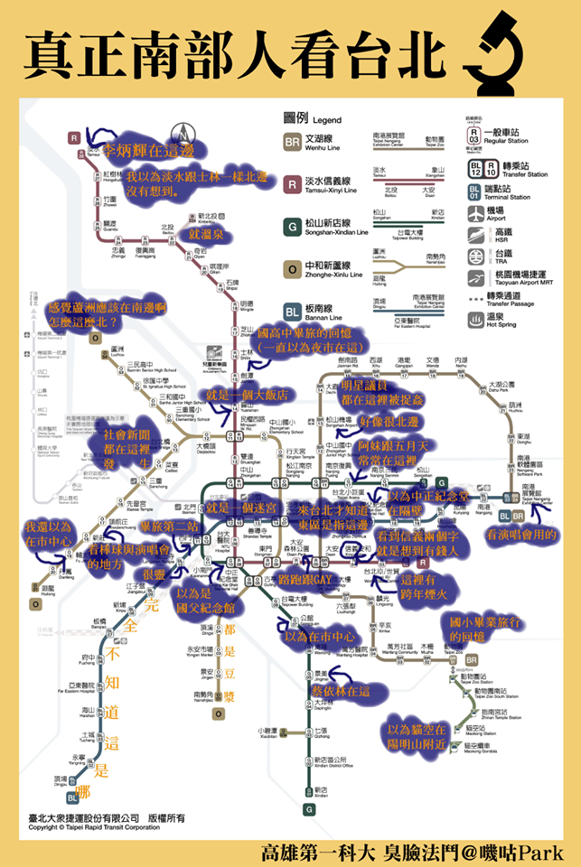 ▼不過也有「正港南部人」看了這張圖之後,認為原PO待在台北太久,已經快忘記自己不是台北人了,於是另做一張圖,寫道:「社會新聞都在橘線發生」、「以為輔大在市中心」、「明星議員都在大直」、「圓山只是一個大飯店」、「來台北才知道東區在這邊」、「永和都是豆漿」、「木柵動物園是國小畢旅的回憶」。