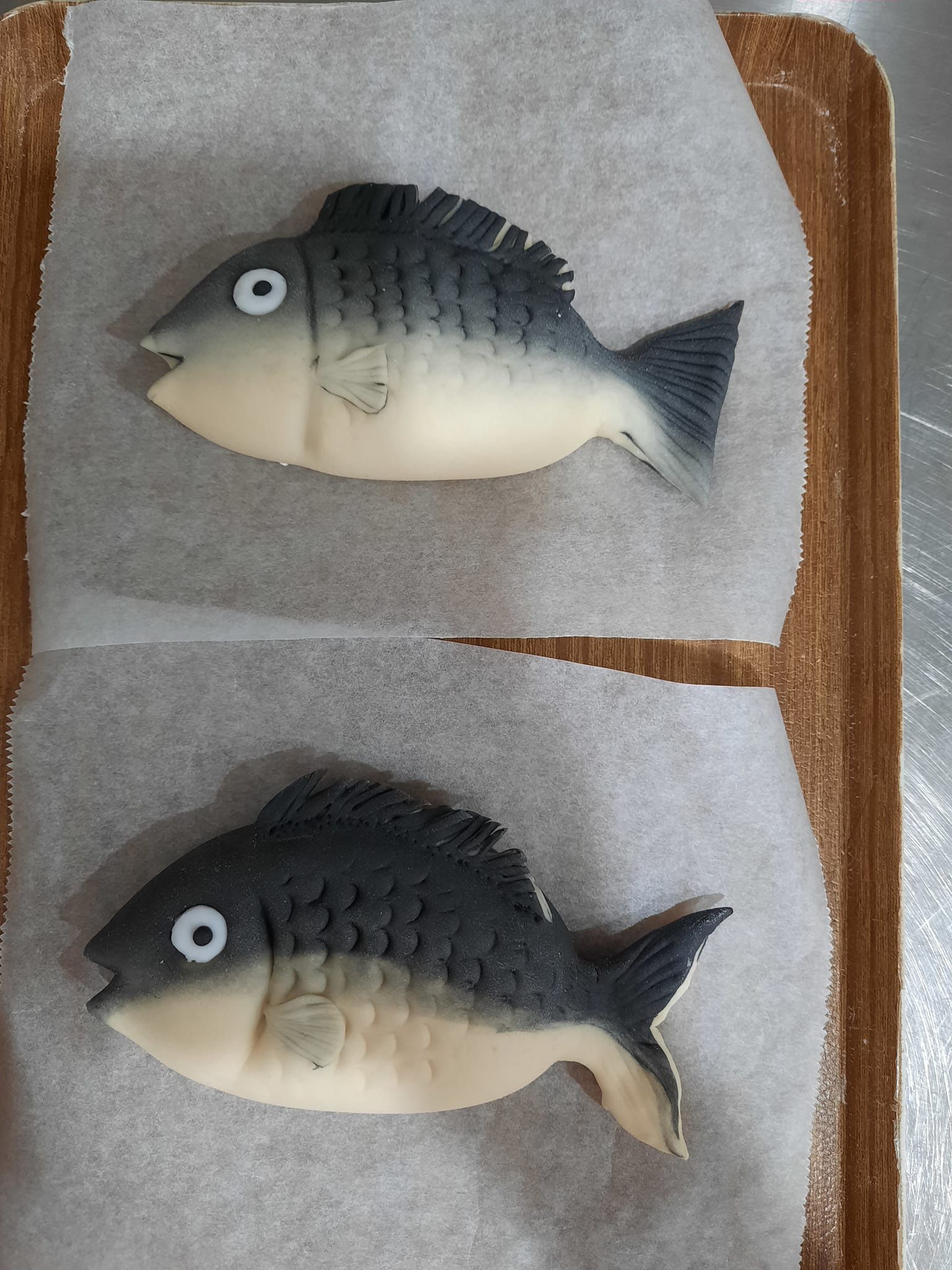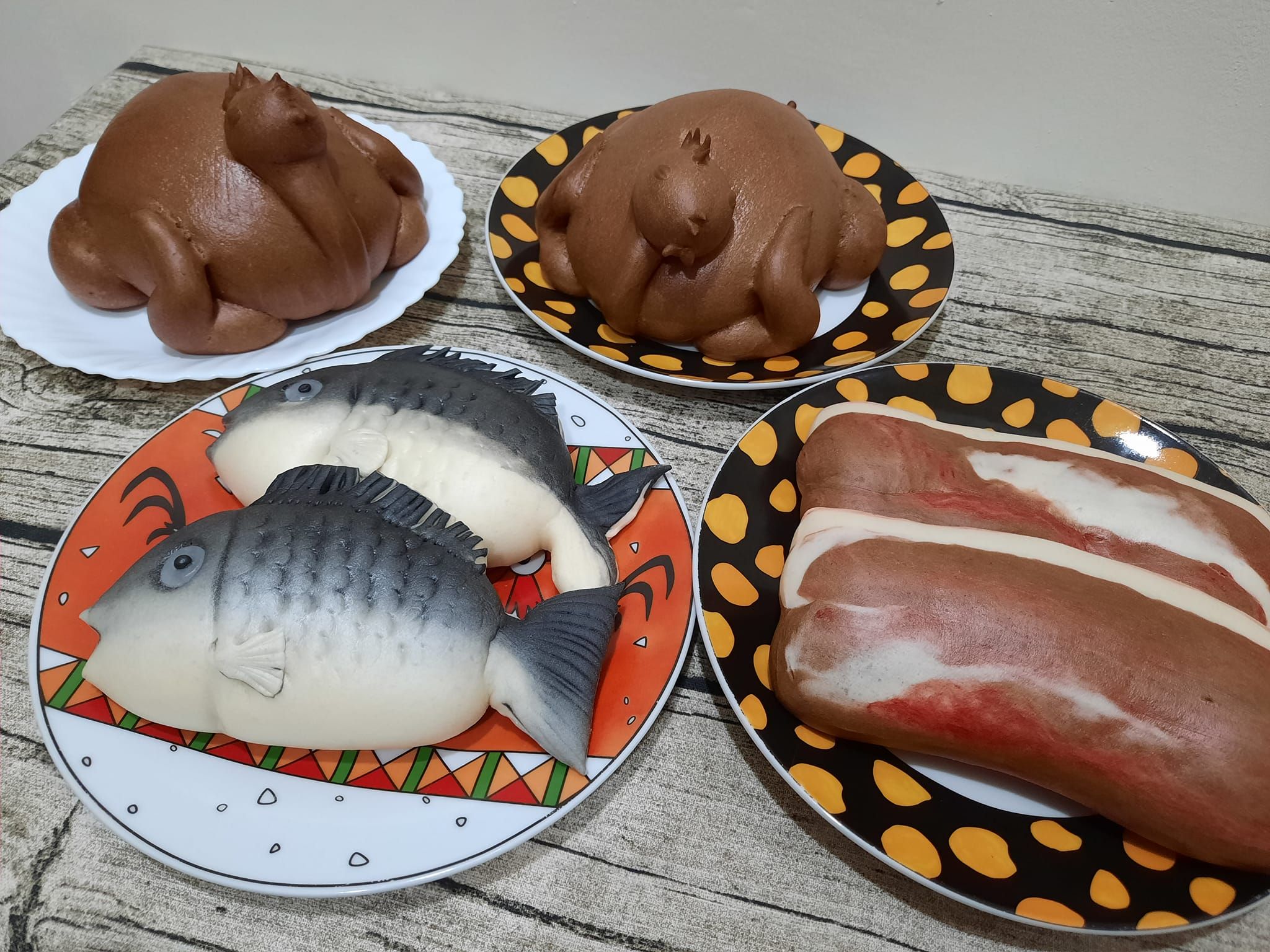 ▼原po透露,她是用中筋麵粉、砂糖、酵母、水、植物油、少許可可粉、竹碳粉、紅麴粉,並包入紅豆泥當內餡製作的素三牲,共做了2隻雞、2條魚和2塊肉來祭拜。這些牲禮造型逼真又可愛,而且細節也做得超棒,魚鱗、臘肉塊的紋理都做得惟妙惟肖。