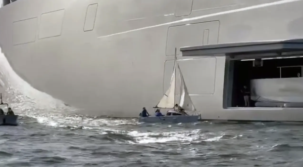 「Sailing Yacht A」是德國頂尖造船廠Nobiskrug建造的,長142.8公尺,共有8個甲板、一座游泳池。甲板下的空間可以容納20位賓客和54位機組人員,龍骨間還有一座水下觀景艙。這艘小帆船碰上巨輪,就像普通人開車上路擦到超跑,帆船上的人一定很心慌吧。