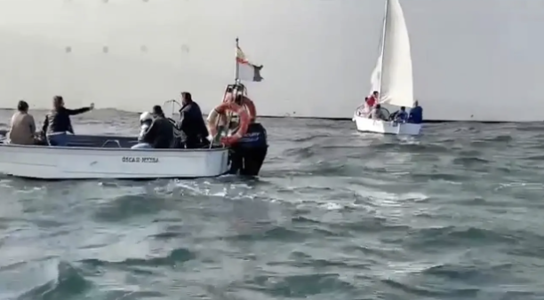 ▼小帆船上的孩子們用西班牙語向父親大聲喊話,那位驚慌失措的父親則手忙腳亂駕駛帆船,想要盡快駛離。小帆船跟巨輪發生剮蹭,在巨輪的船身上留下划痕,具體的修復金額還在估算當中。