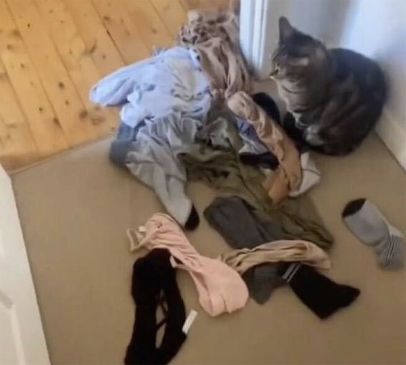 ▼Samantha懷孕5個月時,Luna開始在凌晨3:30左右到處尋找柔軟的衣物,並叼出來堆在一起,佈置成簡單的產房。Samantha早上起床後,Luna就坐在衣物堆裡朝著她喵喵叫,好像在提醒她可以在這裡生小孩。Samantha非常感動,忍不住將牠抱起親親,用這種方式表達自己的謝意。