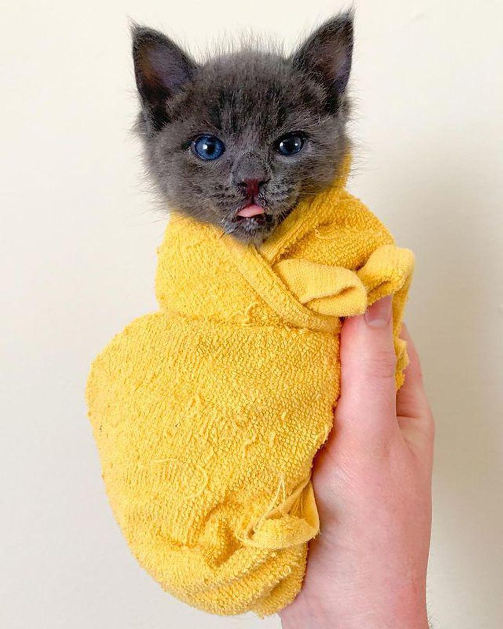 ▼Adam和Margaux開車載小貓回家的路上,牠一直喵喵叫個不停。雖然牠非常虛弱,甚至無法睜開眼睛,但叫聲響亮,生命力非常頑強。