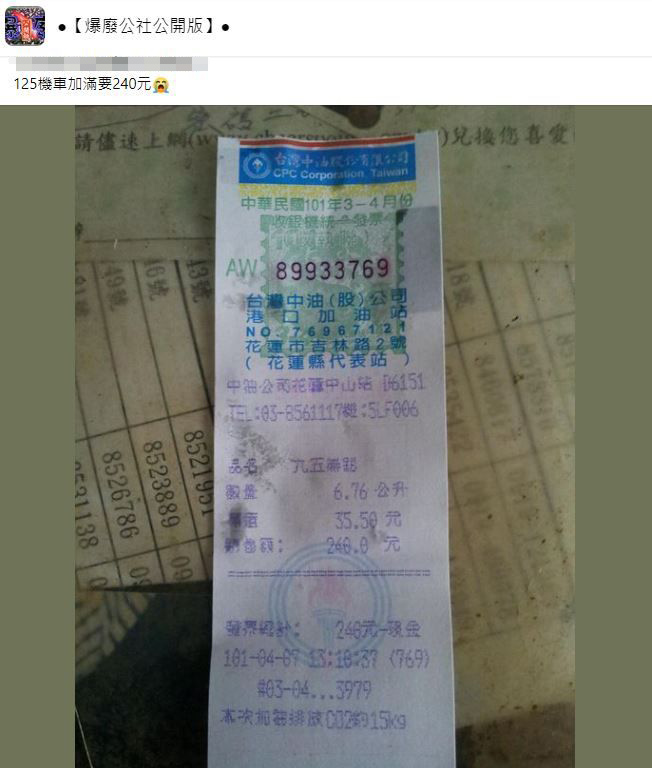 ▼原po曬出一張2012年3、4月的發票,顯示油價單價35.5元。當時他在花蓮加油,加了6.76公升的95無鉛汽油,總計240元。當前中油95無鉛汽油每公升32.5元,機車汽油加滿竟比以前便宜。原po不禁感嘆:「11年前的油價真的比現在高,125機車(勁戰2代)加滿要240元。」