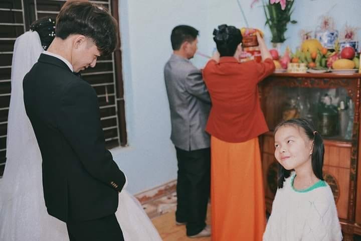 ▼那天叔叔Chính要與女友結婚,父母正在虔誠祭拜祖先,綁著雙馬尾的可愛小姪女跑了過來。她的表情超有戲,不僅偷偷斜視穿著西裝的帥氣叔叔,還翻白眼、微微噘嘴,一臉興師問罪。叔叔就大方多了,他很寵愛這個小姪女,全程微笑與她對視,一點也不怕對方問罪。