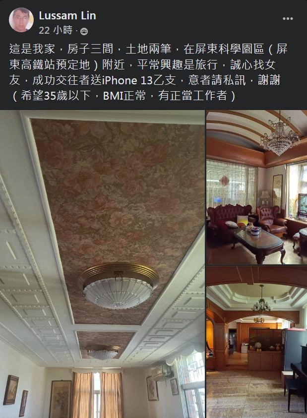 ▼這名男子姓伍,今年42歲。他於7日在臉書徵婚,並po出3張自宅照,說:「這是我家,房子三間,土地兩筆,在屏東科學園區(屏東高鐵站預定地)附近,平常興趣是旅行,誠心找女友,成功交往者送iPhone 13乙支,意者請私訊,謝謝(希望35歲以下,BMI正常,有正當工作者)。」
